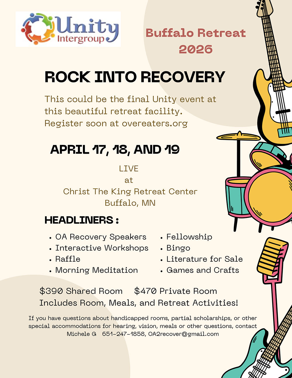 If you have questions about handicapped rooms, partial scholarships, or other special accommodations for hearing, vision, meals or other questions, contact Michele G 651-247-1858, OAQrecover@gmail.com